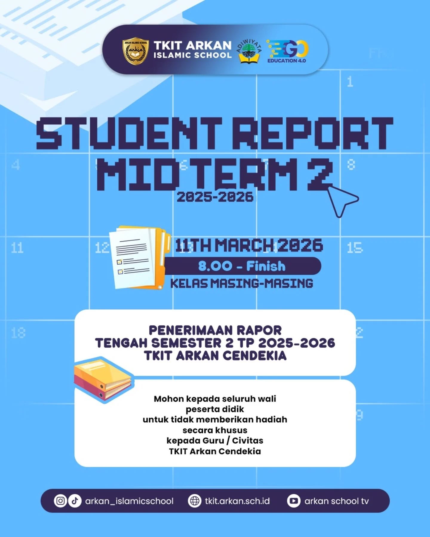 Assalamualaikum warahmatullahi wabarakatuh Segala puji dan syukur kepada Allah yang Maha Esa, Serta sholawat kita curahkan kepada nabi besar Muhammad Shalallahu Alaihi Wassalam. Di era global dan pesatnya Teknologi Informasi sekarang ini, tidak dipungkiri bahwa keberadaan sebuah website untuk suatu organisasi, termasuk Sekolah Arkan Cendekia sangatlah penting.Website dapat digunakan sebagai media penyebarluasan informasi-informasi dari sekolah, yang memang harus diketahui oleh stake holder secara luas. Disamping itu, website juga dapat menjadi sarana promosi sekolah yang sangat efektif. Berbagai kegiatan positif sekolah dapat diunggah, pengumuman disertai gambar-gambar yang relevan, sehingga masyarakat dapat mengetahui prestasi-prestasi yang telah berhasil diraih oleh Sekolah Arkan Cendekia.